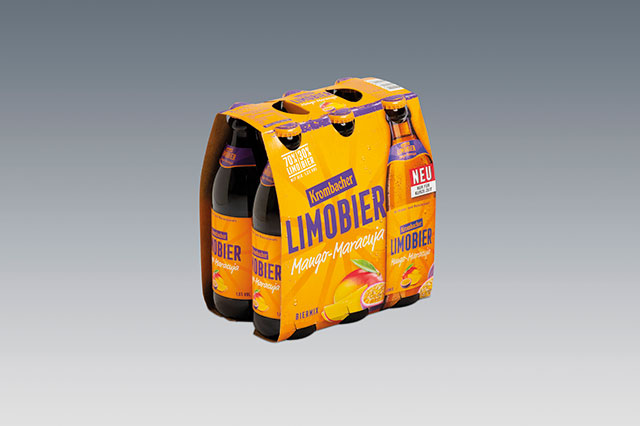 Die Flaschen oder Dosen werden mit bis zu 240 Verpackungen pro Minute in Manschetten, Baskets oder vollverschlossene Schachteln verpackt.